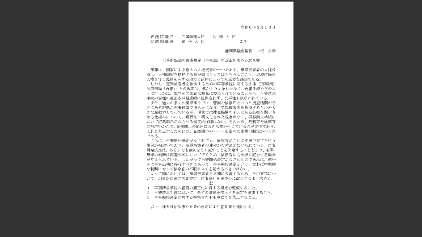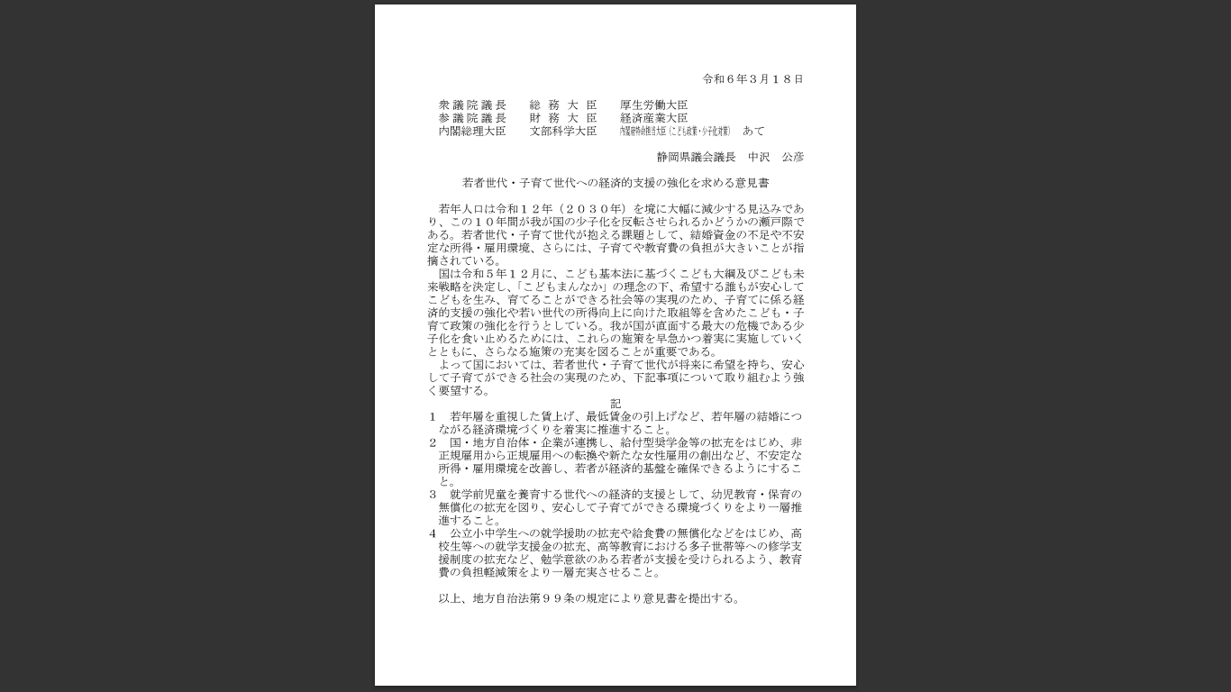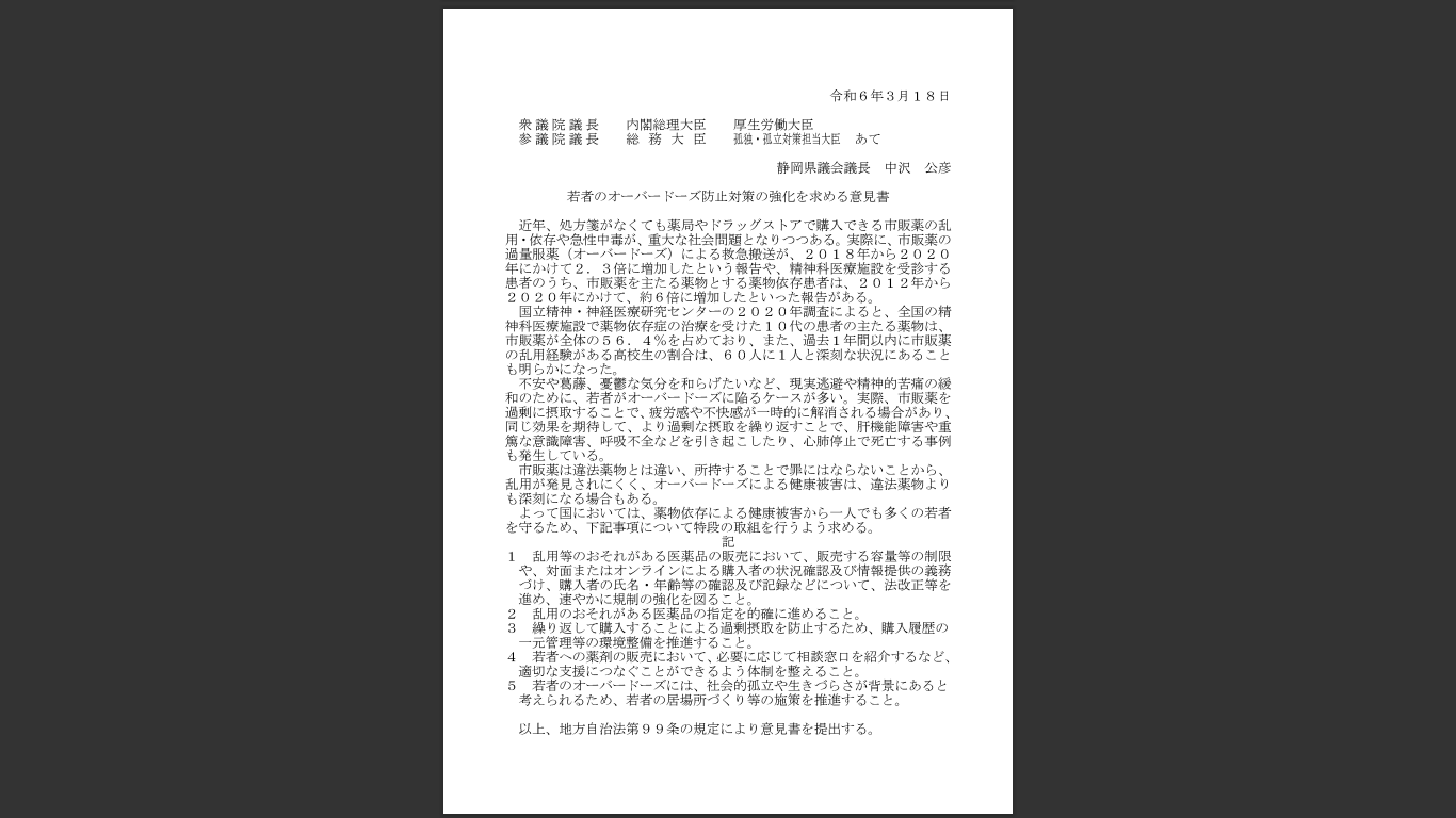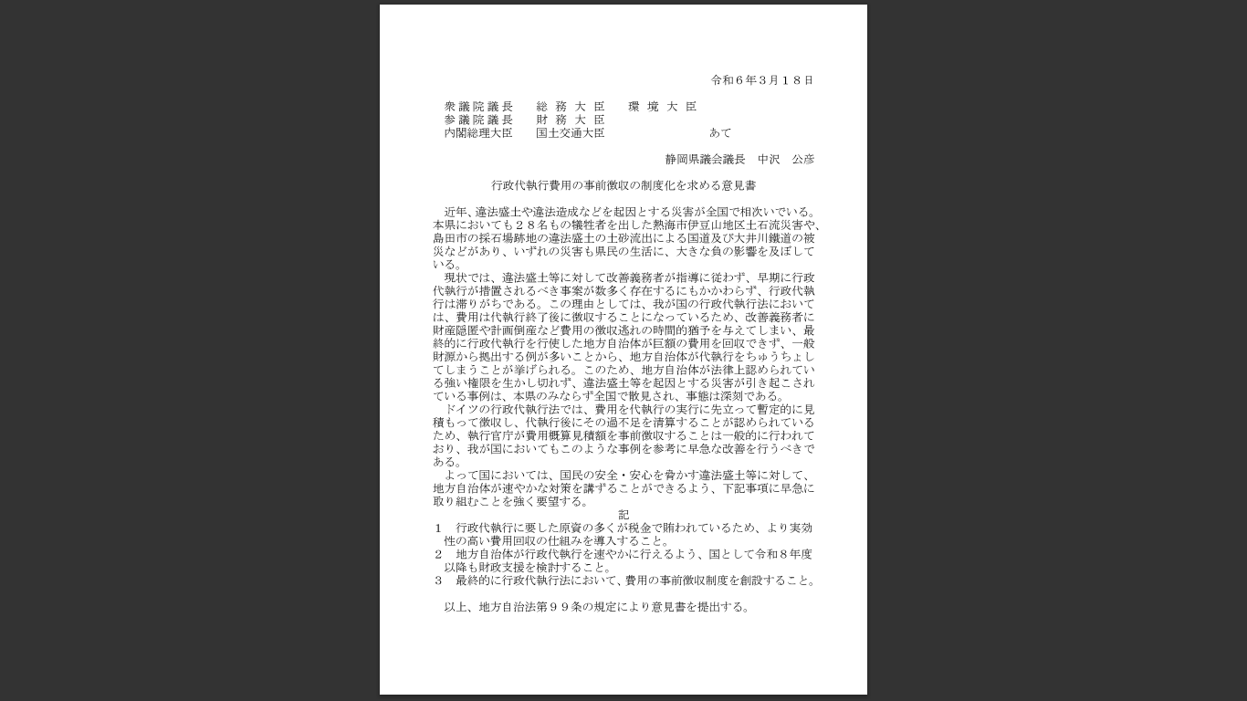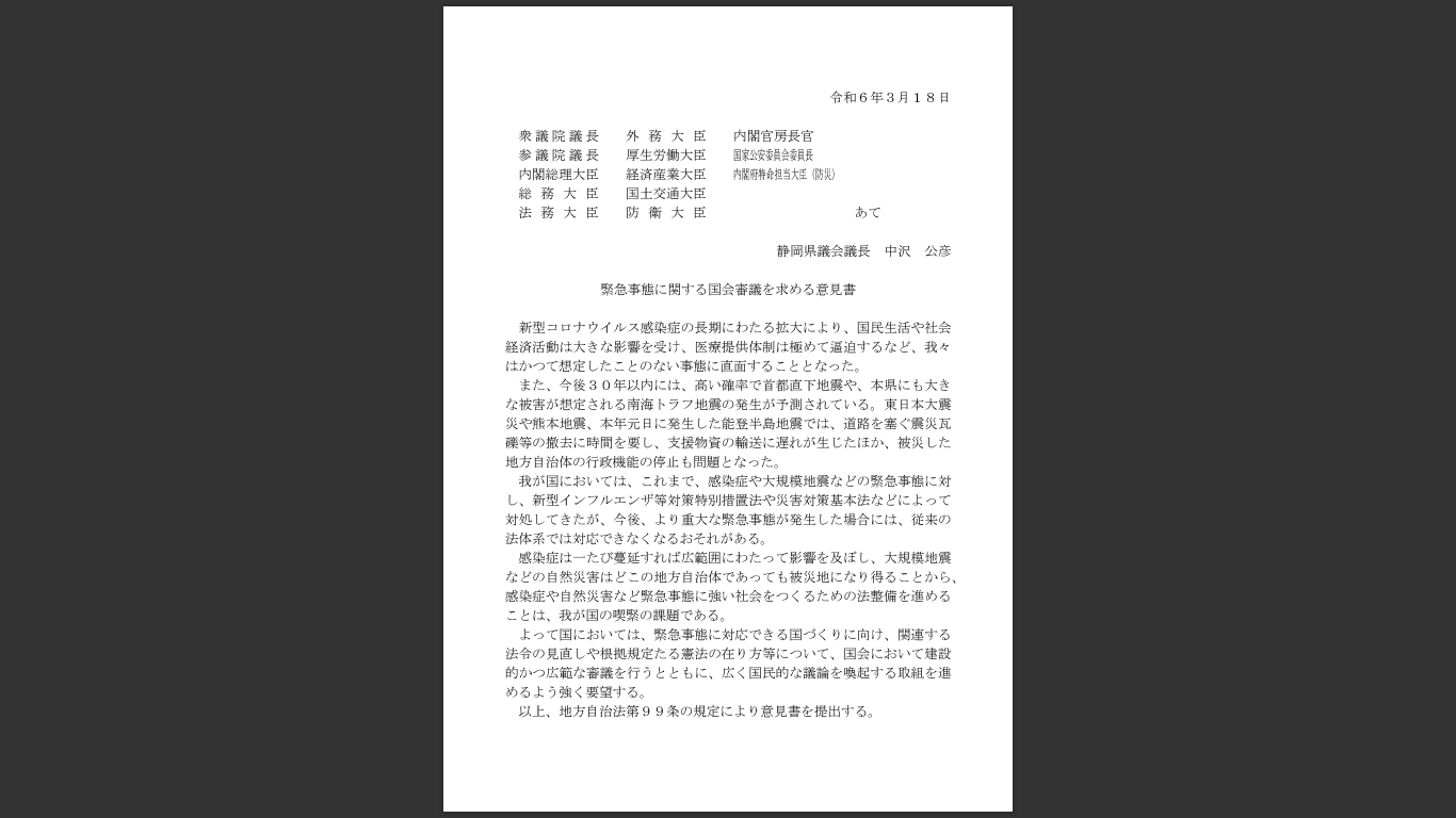 静岡県議会2月定例会では、下記5件の意見書を可決し、内閣総理大臣をはじめ国の関係行政機関等に、その実現を強く要望致しました。