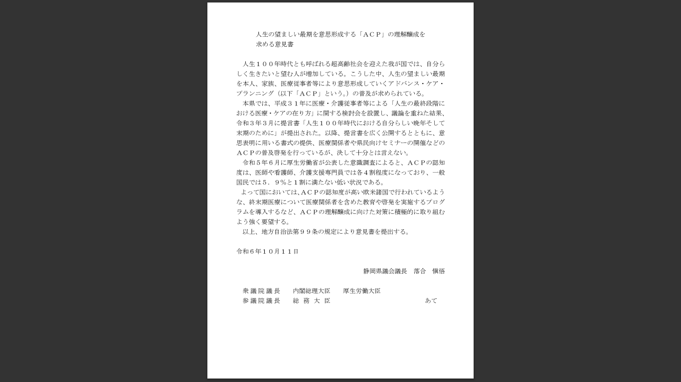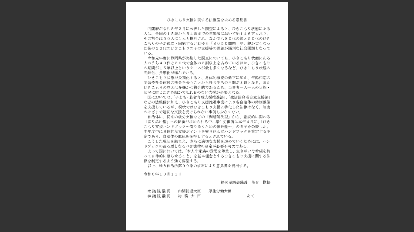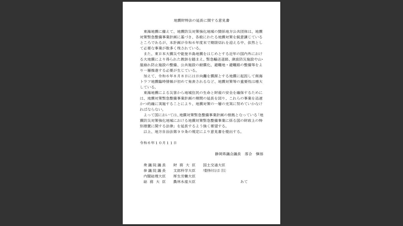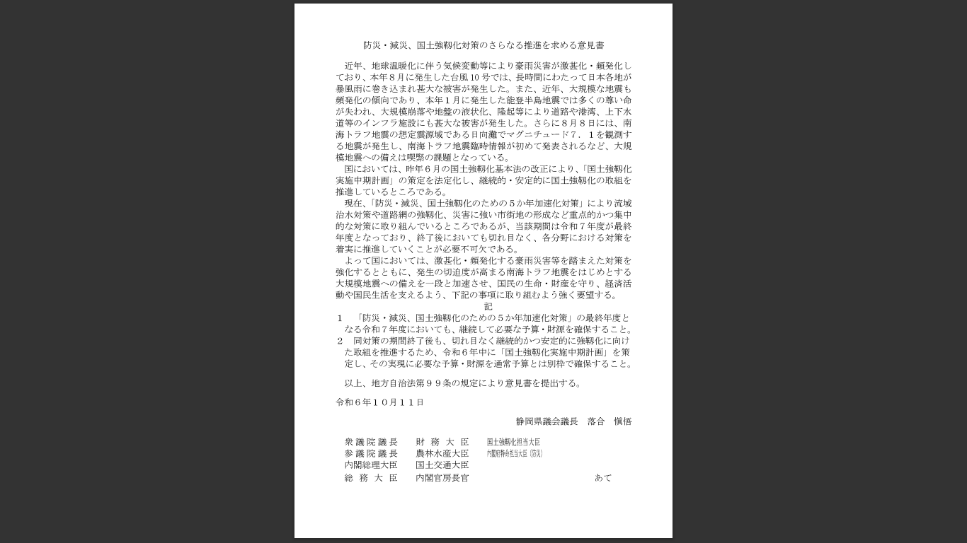 静岡県議会9月定例会では、下記4件の意見書を可決し、内閣総理大臣をはじめ国の関係行政機関等に、その実現を強く要望致しました。