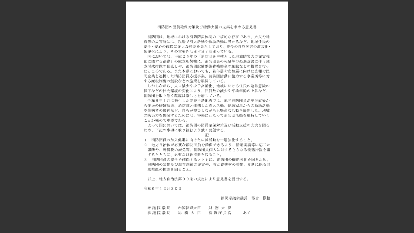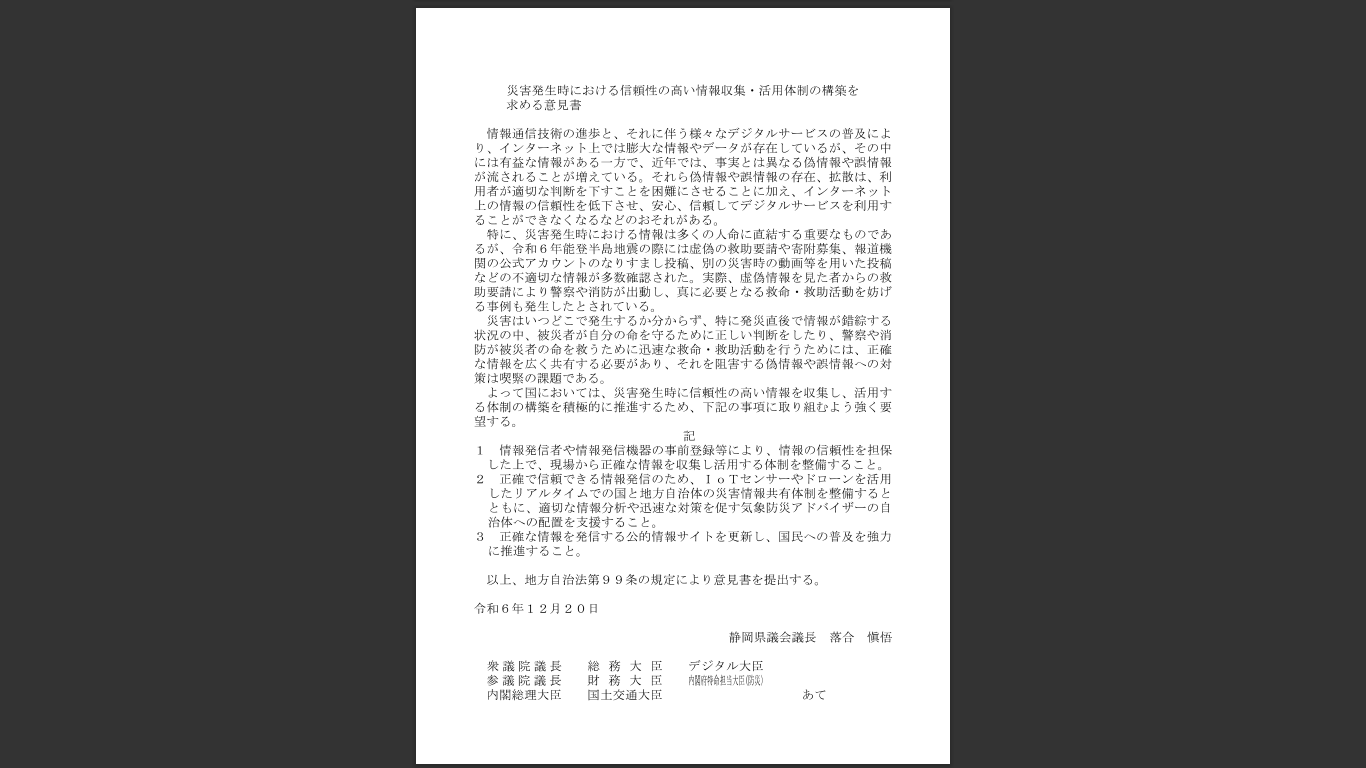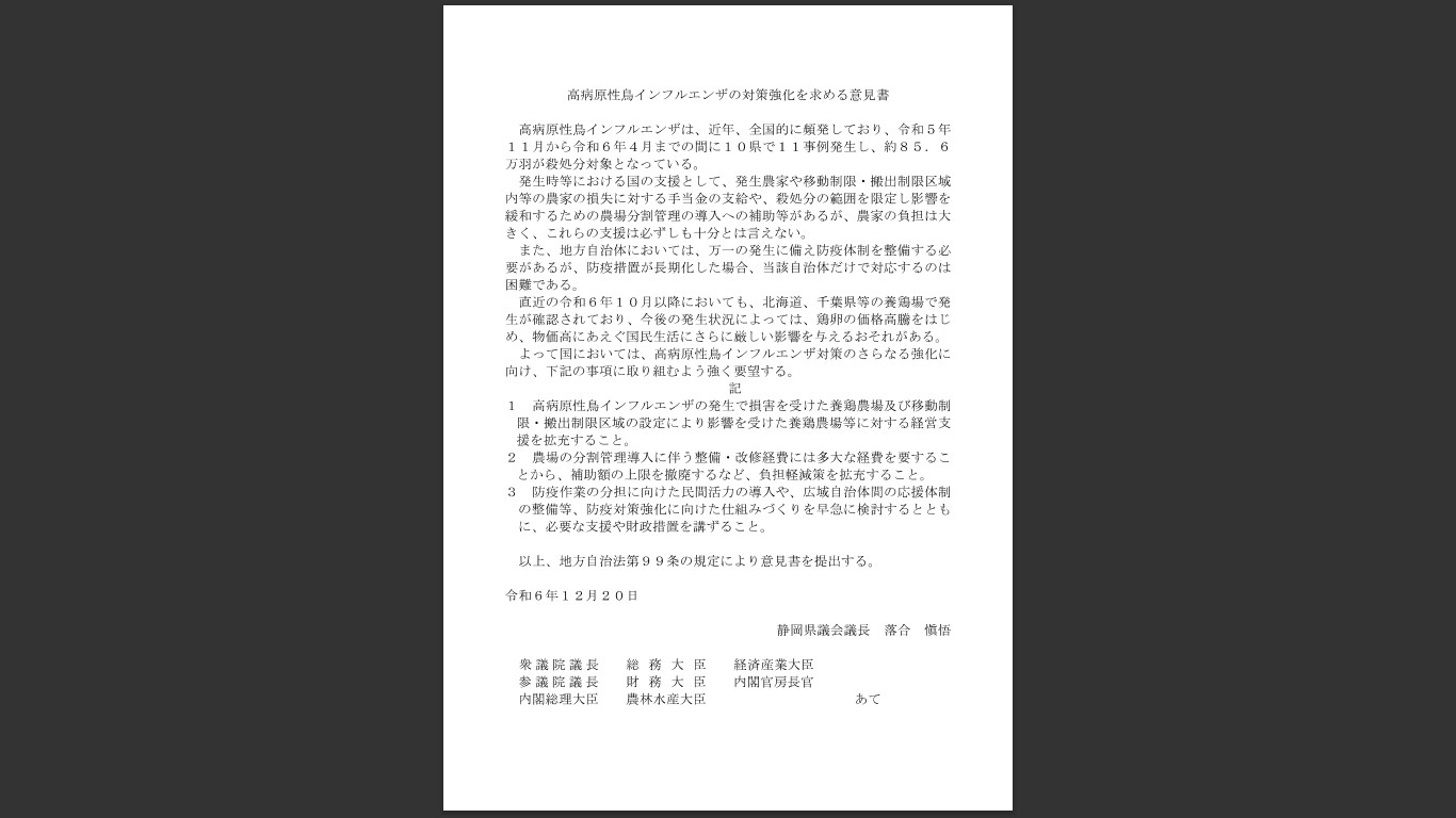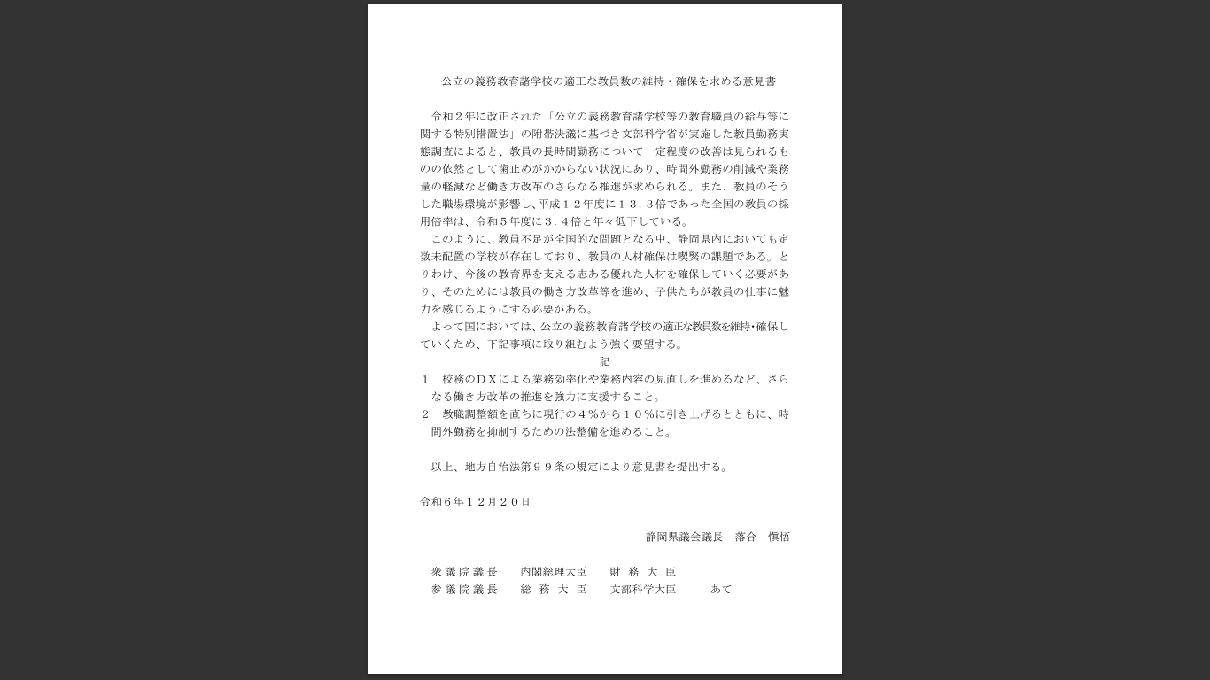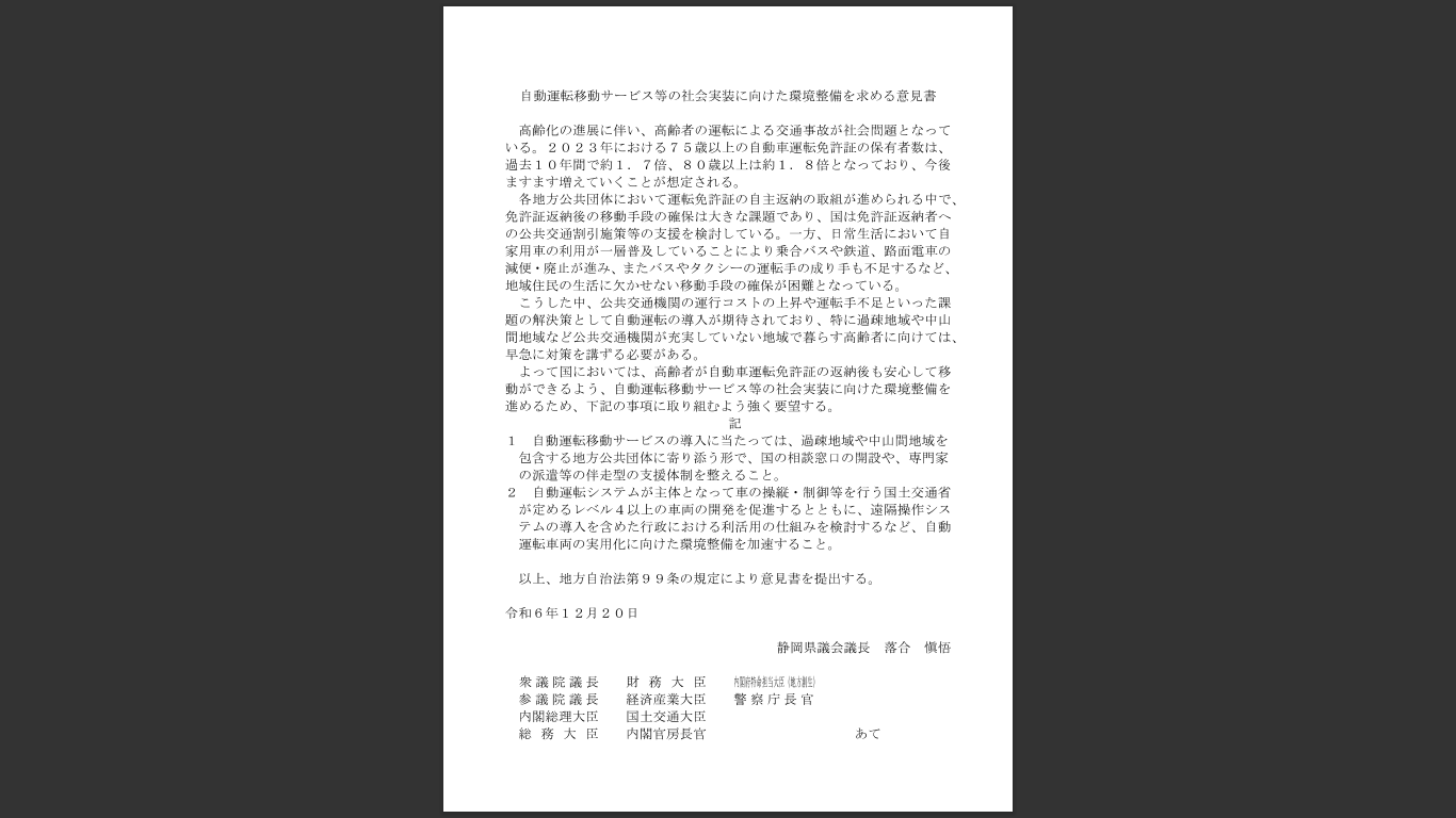 静岡県議会12月定例会では、下記5件の意見書を可決し、内閣総理大臣をはじめ国の関係行政機関等に、その実現を強く要望致しました。
