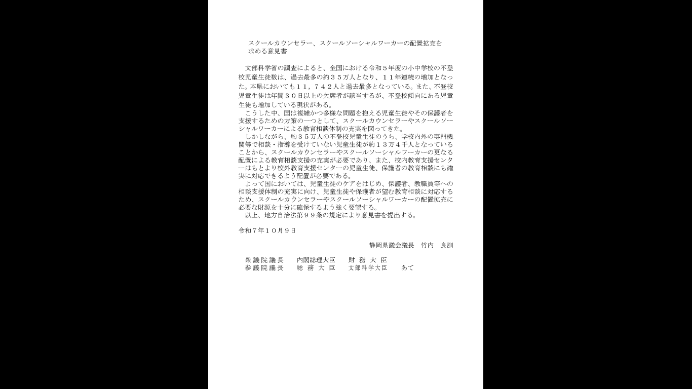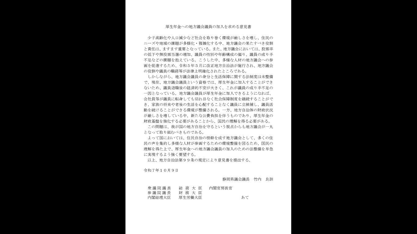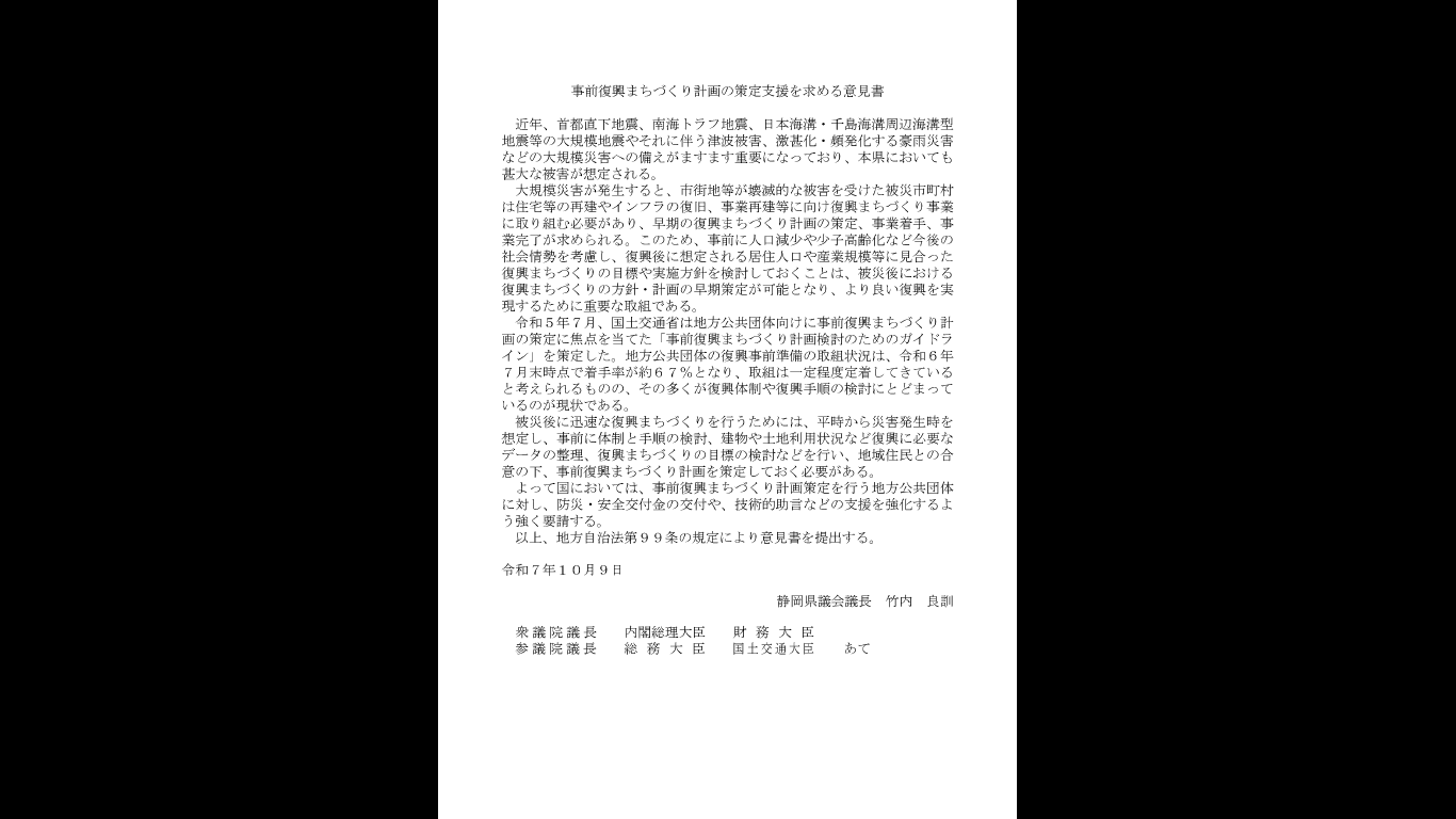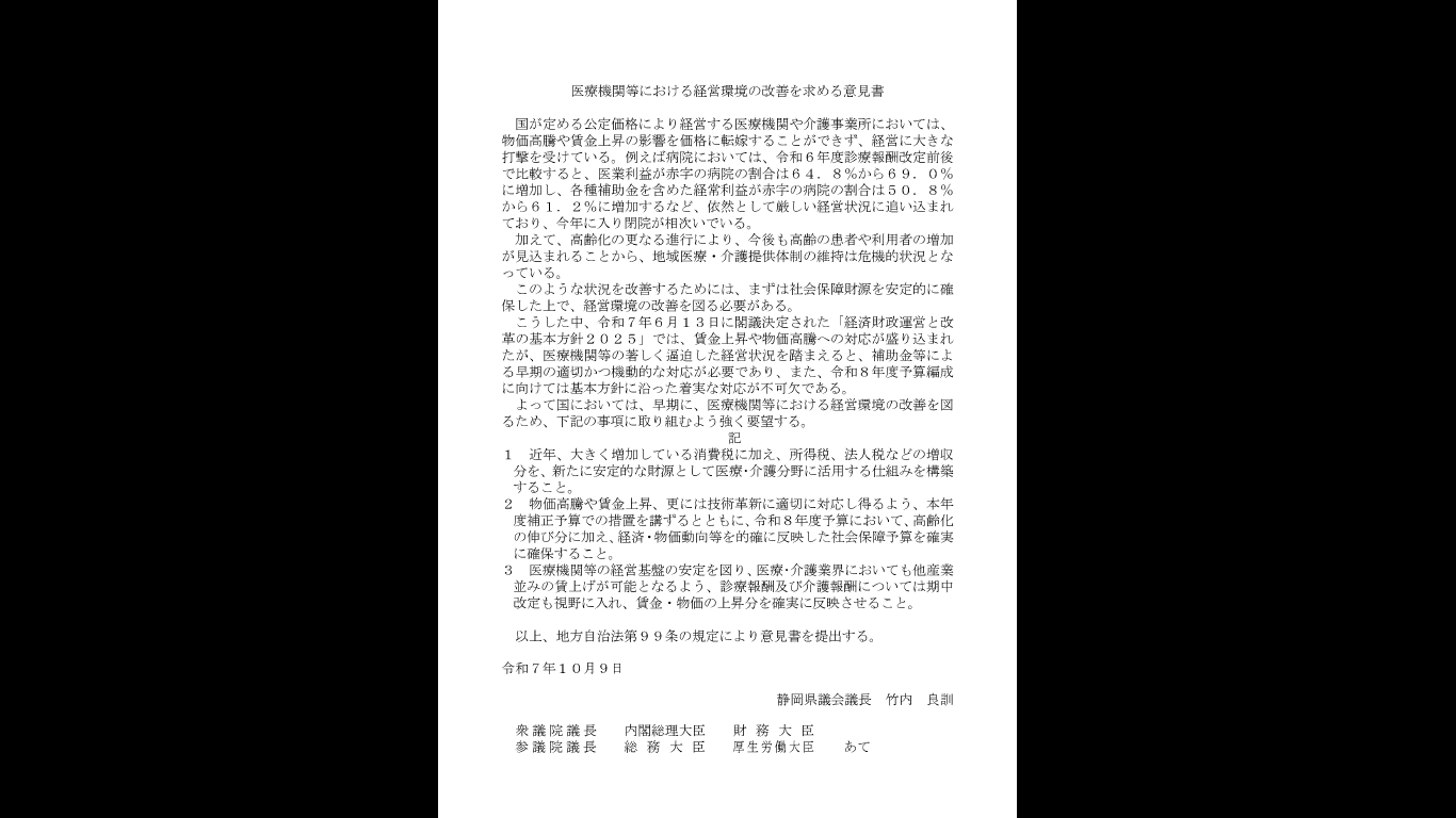 静岡県議会9月定例会では、下記6件の意見書を可決し、内閣総理大臣をはじめ国の関係行政機関等に、その実現を強く要望致しました。