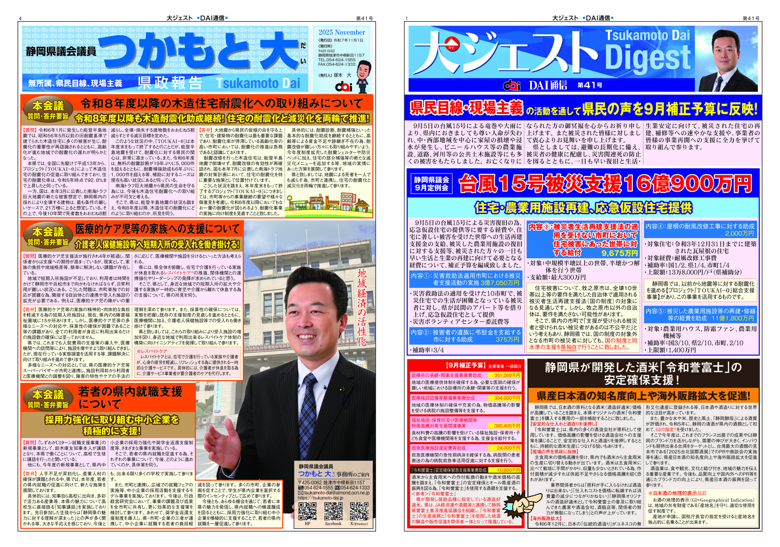 静岡県議会9月定例会の内容を掲載した「大ジェスト第41号」を作成致しました。 11月1日㈯朝刊に新聞折込にて、焼津市内全戸に配布させて頂きますが、ホームページでもご覧頂けます。 ホームページの「活動報告」では、大ジェスト第1号から41号まで全てご覧頂けます。 是非、ご覧ください。